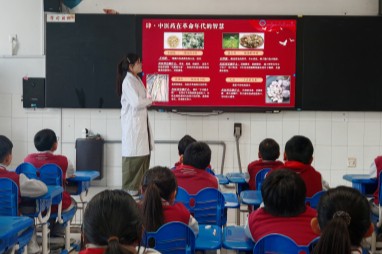 为让同学们更直观地感受红医历史,孙善雯将金银花、大蒜、桑树皮等常见药材摆上讲台,邀请同学们小心翼翼地观察、传看。同学们满脸惊奇,纷纷讨论这些平凡植物的用途。孙善雯详细讲解了每种药材的功效,让同学们了解到,这些常见植物在革命年代物资匮乏的岁月里,曾是守护军民健康的“生命卫士”,帮助同学们完成了一次与历史智慧的隔空对话,也加深了对中医药文化的认知。