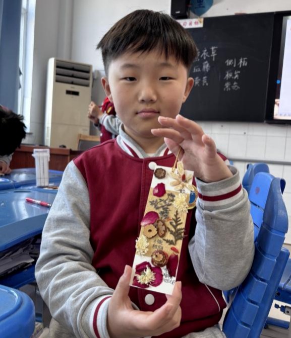 课堂最后,中药书签制作环节将现场气氛推向高潮。同学们自主挑选药材,在书签纸上认真构思、精心摆放,专注创作属于自己的中药图谱,紫苏的清晰叶脉、菊花的雅致形态,连同淡淡的药香,被一同封存在书签中。作品完成后,同学们骄傲地举起自己的作品相互展示,脸上洋溢着创造的快乐,教室里回荡着阵阵赞叹与欢笑。