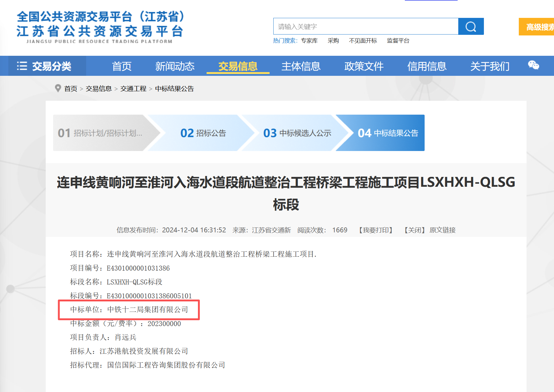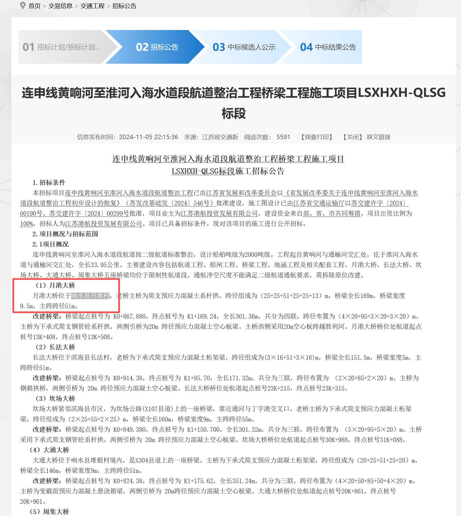 江苏省公共资源交易平台的招标信息显示:2024年11月,江苏港航投资发展有限公司公开招标,具体招标项目为《连申线黄响河至淮河入海水道段航道整治工程桥梁工程施工项目LSXHXH-QLSG标段》。项目概况介绍:连申线黄响河至淮河入海水道段航道按二级航道标准整治,设计船舶吨级为2000吨级。工程起自黄响河与通榆河交汇处,讫于淮河入海水道与通榆河交汇处,全长33.95公里,主要建设内容包括航道工程、船闸工程、桥梁工程、地涵工程及相关配套工程。月港大桥、长法大桥、坎场大桥、大通大桥、周集大桥五座桥梁均位于限制性航道段,通航净空尺度不能满足二级航道通航要求,需拆除原位改建。中铁十二局集团有限公司以报价202300000元中标。