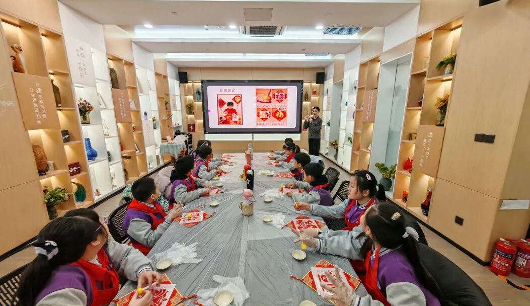 最令人期待的是非遗拓印环节。工作人员先讲解拓印的历史渊源,让孩子们理解这项技艺的价值,随后分步演示宣纸铺展、拓包蘸粉、轻拍拓印的要领,强调“轻、匀、稳”的小技巧。