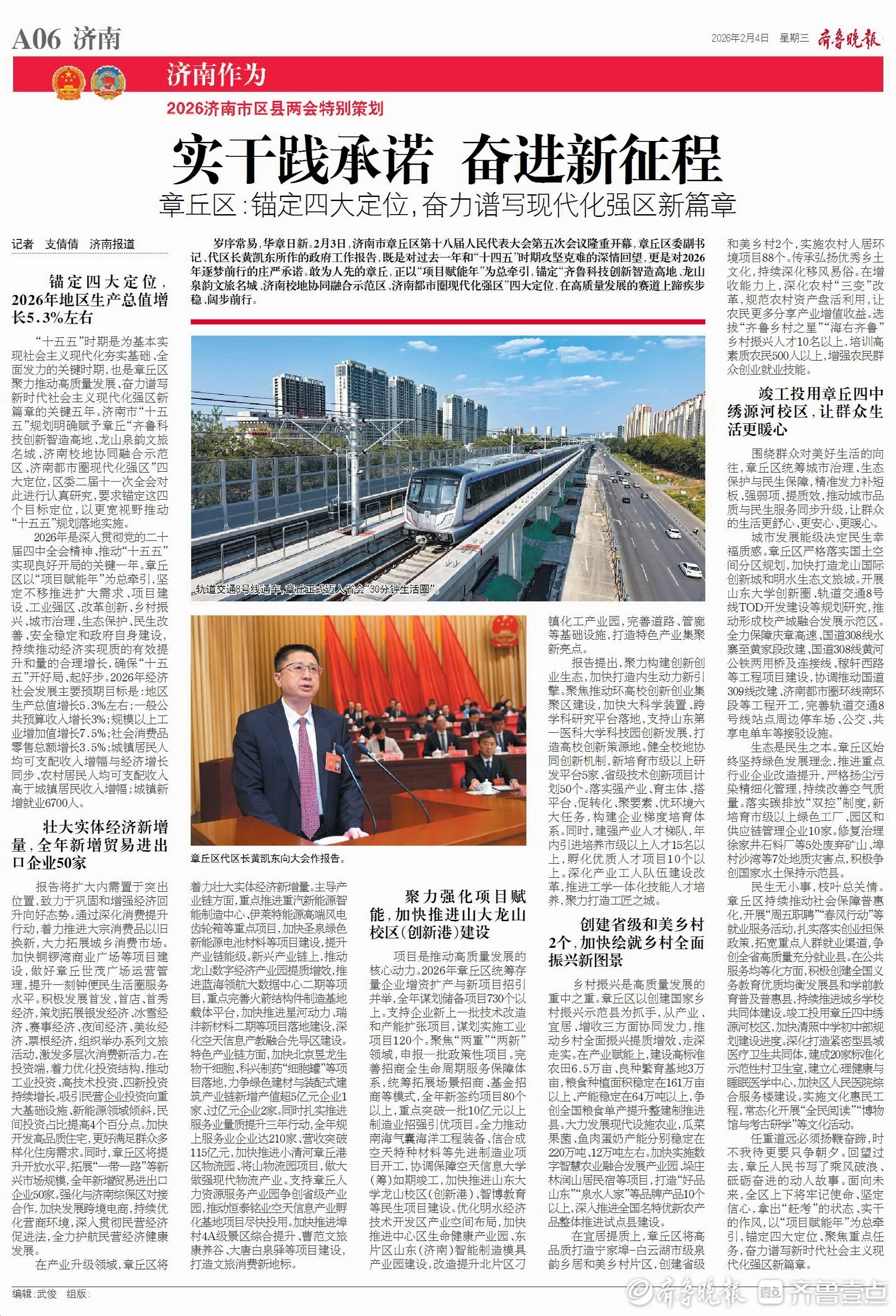 岁序常易,华章日新。2月3日,济南市章丘区第十八届人民代表大会第五次会议隆重开幕,章丘区委副书记、代区长黄凯东所作的政府工作报告,既是对过去一年和“十四五”时期攻坚克难的深情回望,更是对2026年逐梦前行的庄严承诺。敢为人先的章丘,正以“项目赋能年”为总牵引,锚定“齐鲁科技创新智造高地、龙山泉韵文旅名城、济南校地协同融合示范区、济南都市圈现代化强区”四大定位,在高质量发展的赛道上蹄疾步稳、阔步前行。