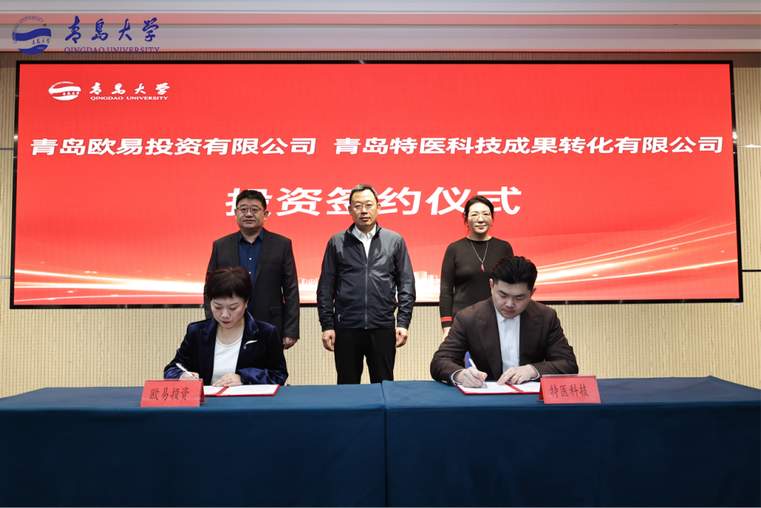 青岛欧易投资有限公司董事长刘敬、青岛特医科技成果转化有限公司董事长郑强签署青岛欧易投资有限公司投资青岛特医科技成果转化有限公司协议。