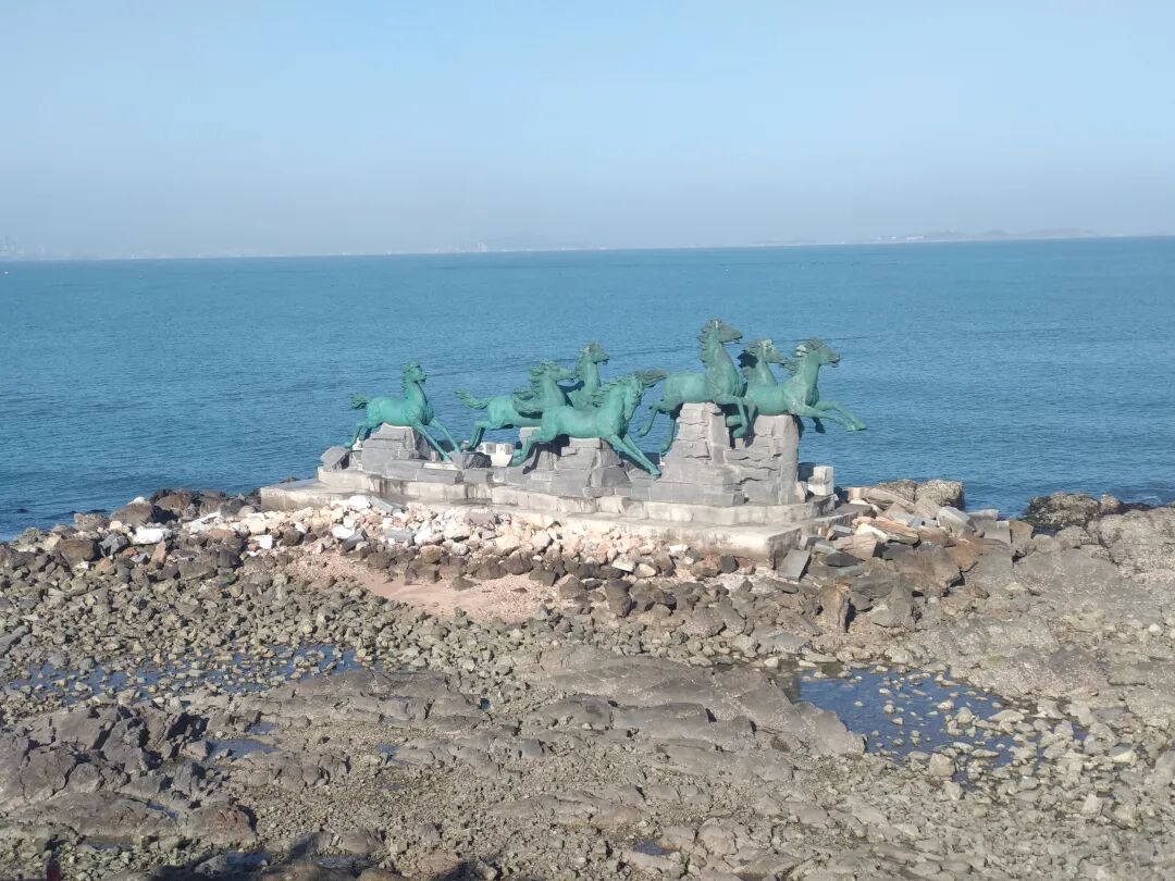 再向东行四十里,便是牟平的养马岛了。这里的春潮,似乎比别处更要温柔些,轻轻地、一下一下地,抚摸着那些传说中秦始皇东巡时留下的遗迹。当年那位横扫六合的千古一帝,车辇隆隆地来到这天之尽头,望着烟波浩渺中的海市蜃楼,那长生不老的渴望,该是何等的炽烈!然而,仙山可望而不可即,他最终只能在这饮马池畔,留下满腔的怅惘,郁郁西归。金戈铁马之声,早已消散在两千多年的风里,唯余礁岩上“天马苑”三个斑驳的大字,与石缝间星星点点的野花寂然相对。环岛路上,新栽的柳树垂下万千丝绦,如少女的秀发,在春风里飘拂。一座现代的秦皇雕塑,英武地遥指着沧海。历史与现实,雄图与怅惘,在此刻凝结成一道永恒的弧线,被这春日的阳光,镀上了一层柔和的金边。