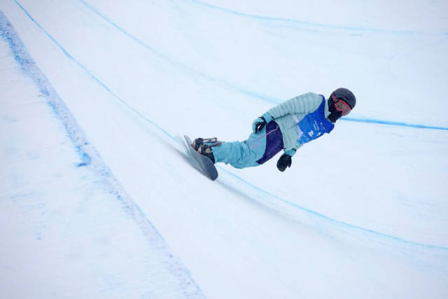 2025年12月12日,中国选手蔡雪桐在比赛中。当日,单板滑雪U型场地技巧世界杯女子组决赛在河北省张家口市崇礼区举行。
