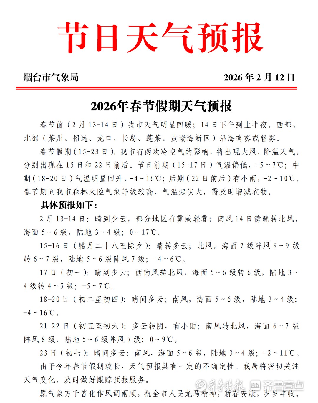 2月12日,烟台市气象局发布2026年春节假期天气预报。春节前(2月13—14日)烟台市天气明显回暖;14日下午到上半夜,西部、北部(莱州、招远、龙口、长岛、蓬莱、黄渤海新区)沿海有雾或轻雾。