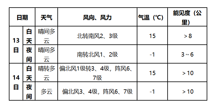 13日中午至14日中午,烟大航线多云,偏南风4~5级,阵风5级,夜间至早晨有能见度不足10公里的轻雾;琼州海峡多云,偏东风4~5级、阵风6级,夜间至早晨有能见度不足10公里的轻雾;两岸“小三通”两马航线多云,偏东风转偏南风4~5级,阵风5~6级,夜间至早晨有能见度不足10公里的轻雾;厦金航线天气多云到晴,东北风3~4级,能见度较高;舟山水域多云转阴有时有小雨,偏南风5~6级,阵风6~7级,13日夜间起,有能见度不足10公里的轻雾,关注低能见度对海上航行的不利影响。