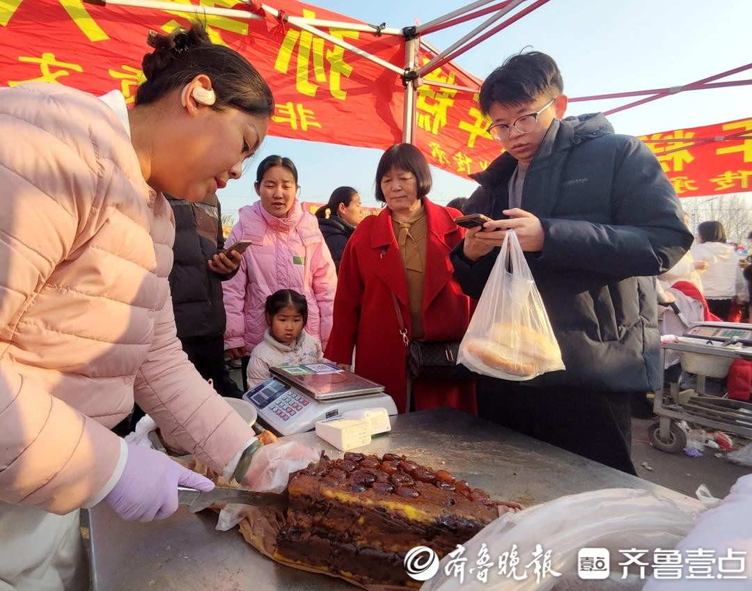 还有不少摊主架起直播手机,让更多人看到眼前的热闹。做了二十多年老式奶油面包的卢廷芳,身着汉服,竖起“曹洼大集我替你看了”打卡路牌,一边售卖奶油面包一边与网友互动。下播后,她再处理线上订单。用线下销售场景引流,线上促成更多交易,一天下来她能卖出2000多个面包。