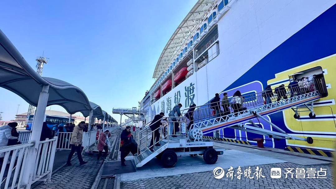 2月11日上午,在烟台港码头,前往大连方向的旅客陆续登上渤海轮渡“中华复兴”轮