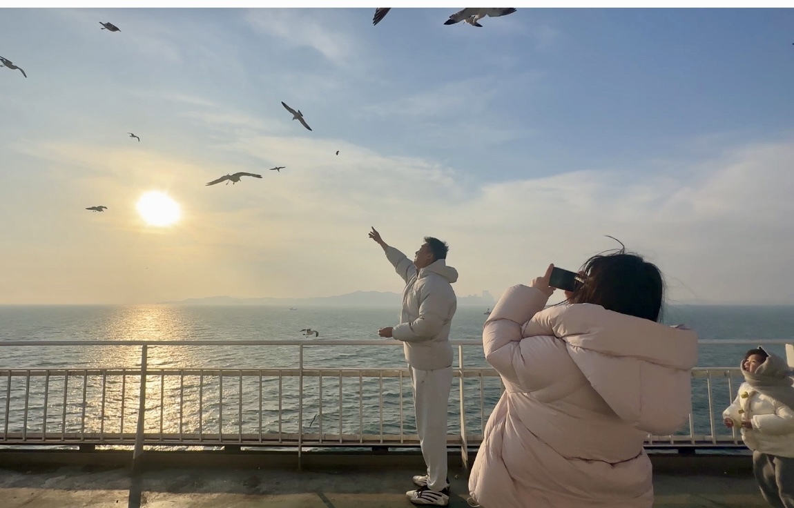 十层甲板上,海风正劲。来自广东的乘客纪秀琳正在拍海鸥、日落。她是广东潮汕人,这次北上没有订返程票,没有做攻略,只有一个明确目标:坐渤海轮渡。“我在小红书上刷到过一句话——‘失联的6.5小时’。就是想在海上,没有信号,纯粹地放空。”她顿了顿,“今天阳光特别好,一望无际的海,适合想事情,也适合什么都不想。”