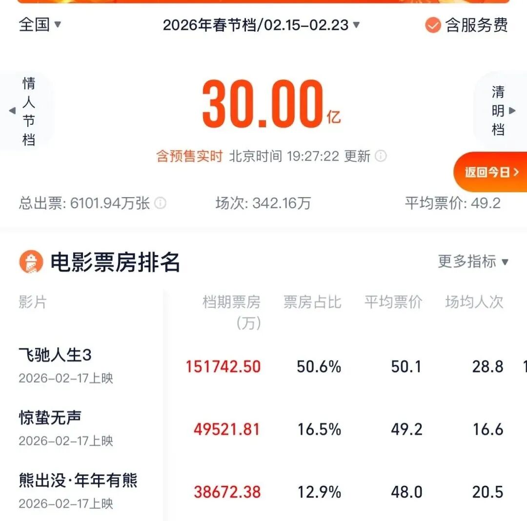 据网络平台数据 2026年春节档电影总票房(含预售) 突破30亿元 《飞驰人生3》暂列春节档票房榜首位 《惊蛰无声》《熊出没·年年有熊》 分列第二位和第三位 (央广网)