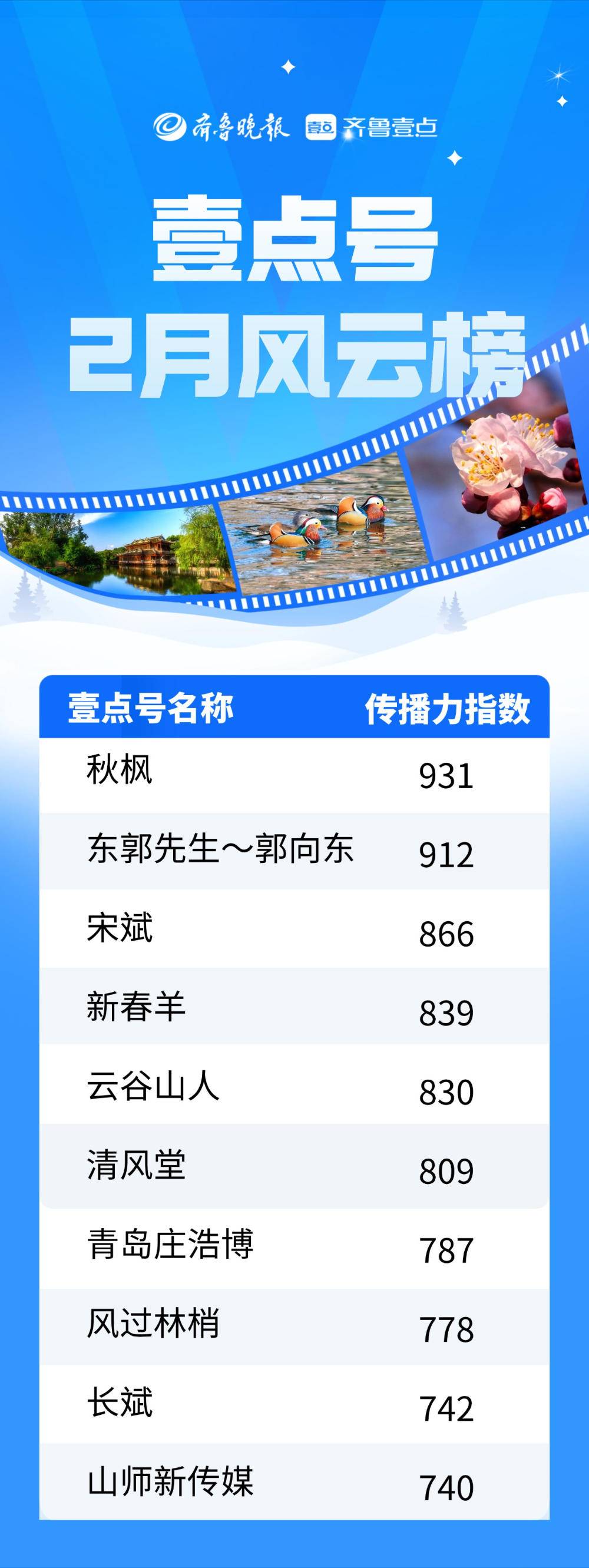 月度风云榜聚焦创作者综合表现,兼顾内容质量、阅读量、评论互动量、粉丝量,筛选出深耕领域、持续输出的优质账号。经加权核算,秋枫、东郭先生~郭向东、宋斌、新春羊、云谷山人、清风堂、青岛庄浩博、风过林梢、长斌、山师新传媒等10个优秀壹点号脱颖而出,荣登2月月度风云榜。他们或聚焦齐鲁烟火,或解读热点民生,或深耕文化传承,用坚守与热爱,打造出有温度、有深度、有力度的原创内容,成为平台创作的中坚力量。每位上榜者可以获得流量扶持、海报赋能及200元的现金红包奖励。