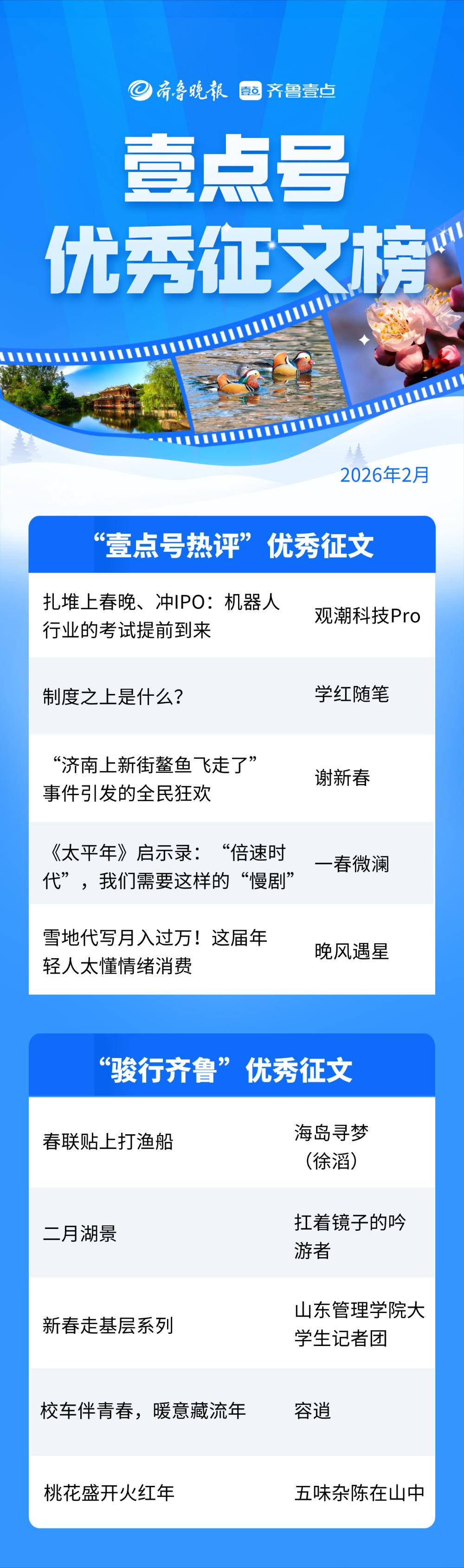月度热文榜则聚焦作品传播力与影响力,参考壹点号作品的阅读量与质量,选出10篇优秀作品入围月度。从新春民俗的细腻描摹,到民生热点的深度解读,从乡土风情的生动呈现,到时代奋进的有力书写,每一篇热文都承载着创作者的用心,也传递着齐鲁大地的烟火与温情。每一位上榜者可以获得流量扶持、海报赋能及200元的奖励等权益。