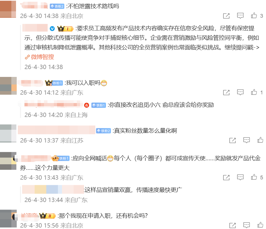 4月30日,追觅科技CEO俞浩发文要求员工开通所有平台账号:每一个追觅员工,都开通一下所有平台的社交媒体账号!每天用15分钟视频,发三条视频,介绍一下你正在做的产品和技术!或者介绍一下公司的各个产品卖点!核心技术和创新!光追觅员工自身,就要有至少两万多个账号!